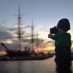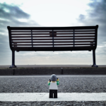 - La minifig de Lego con su gorrito tomándole foto a un barco en las lejanías.