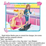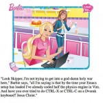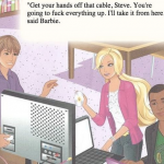 En el libro, Barbie le pide ayuda a sus dos amigos hombres para arreglar problemas o completar proyectos, infecta la computadora de su hermana y dice cosas como “Yo sólo estoy haciendo las ideas de diseño”. Algo dudoso para un libro que se supone debe inspirar a las niñas, ¿no? Ofensivo o no, ante este material surgió una divertida respuesta en Internet: memes de “Feminist Hacker Barbie”.