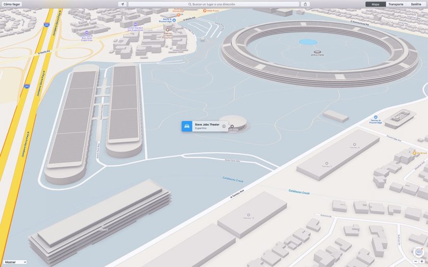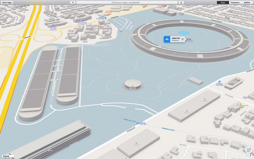 Por otro lado, Apple decidió que ya era oportuno que su nueva casa apareciera formalmente en sus mapas donde a pesar que la imagen satelital todavía se ve un campus en construcción, la versión en mapa y el rendereado en 3D han sido actualizados detallando los edificios y caminos dentro del campus.