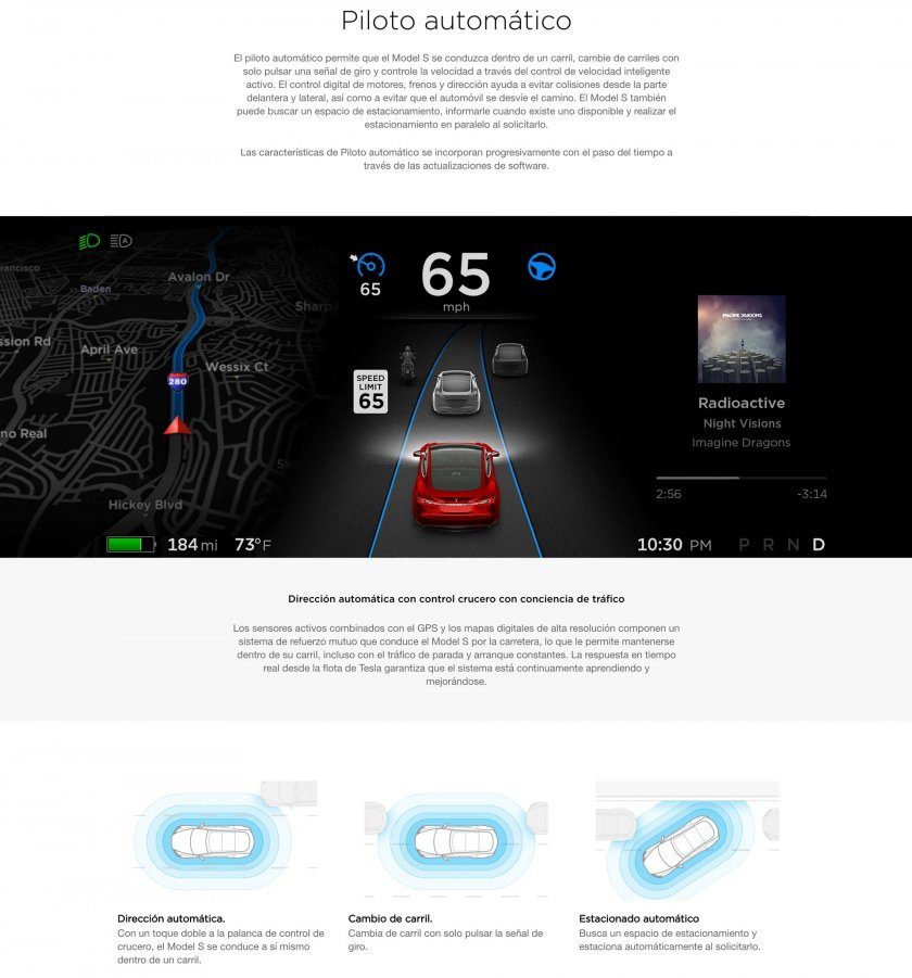 - En la sección del piloto automatico de la página del Modelo S de Tesla, se menciona de manera indeterminada que se encuentra en constante mejora debido a que es una solución en desarrollo