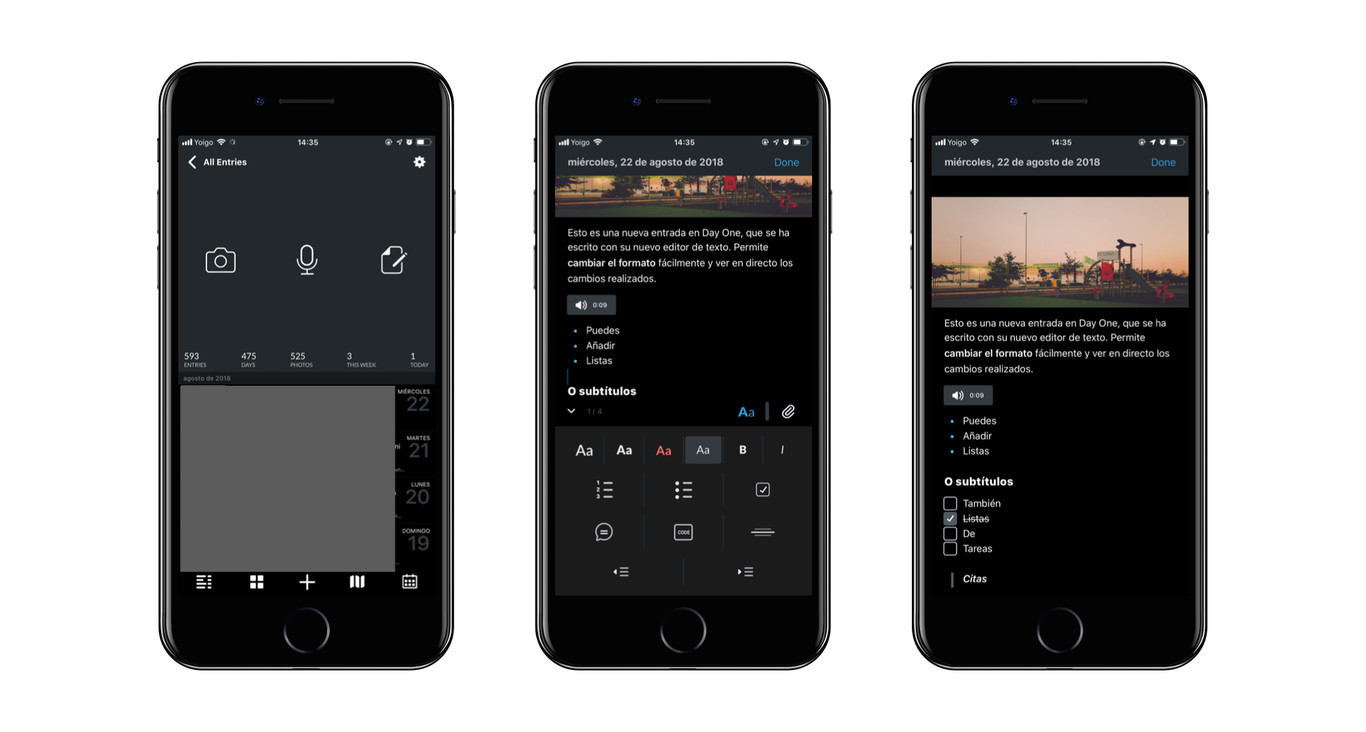 El modo oscuro es otra de las innovaciones que tiene Day One, porque ahora la aplicación puede ser activada en un modo que permita descansar la vista, evitando que ésta se fuerce con la recepción de luz que emite el propio celular.